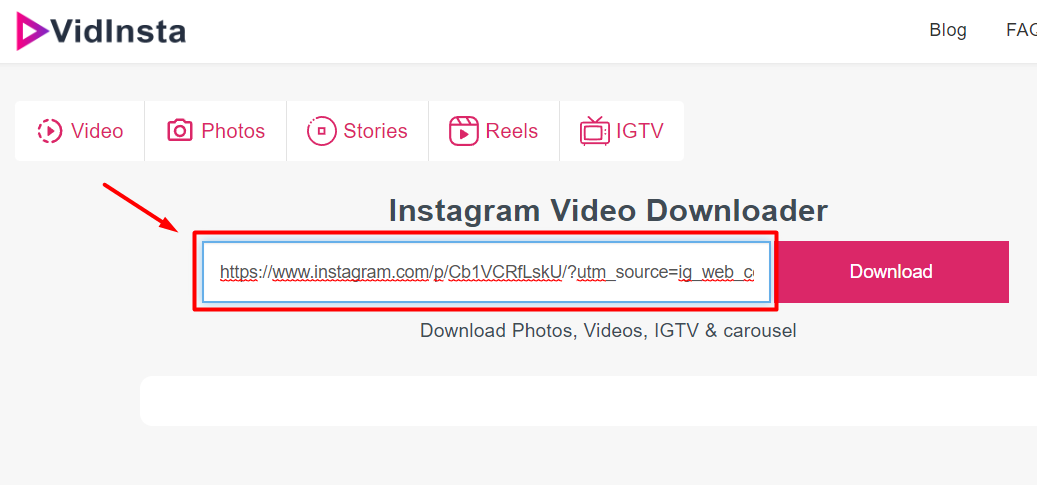 Step 2: Open a web browser and go to Vidinsta.io and paste your link into the tool and click Download