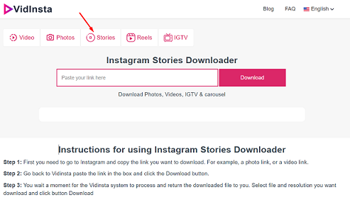 Once you visit the Vidinsta website, you’ll see the main interface. Simply click on the “stories” button to access the Instagram story downloader tool and start downloading the Instagram story you want.